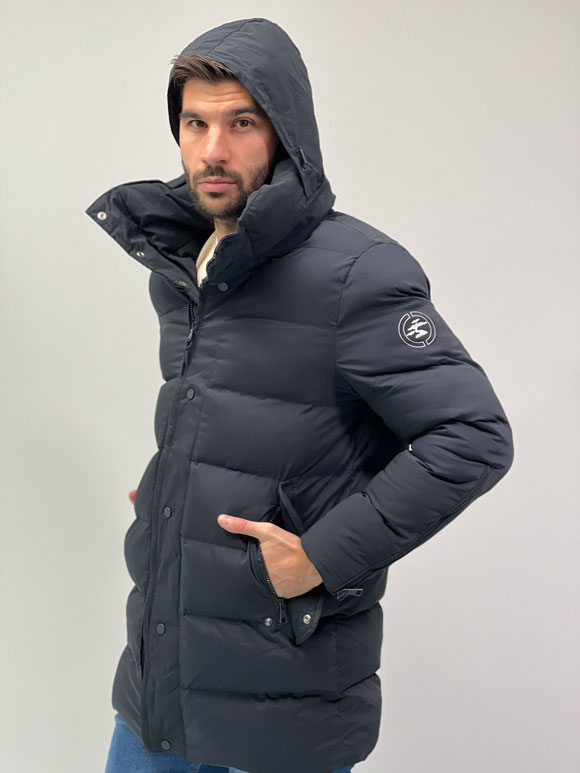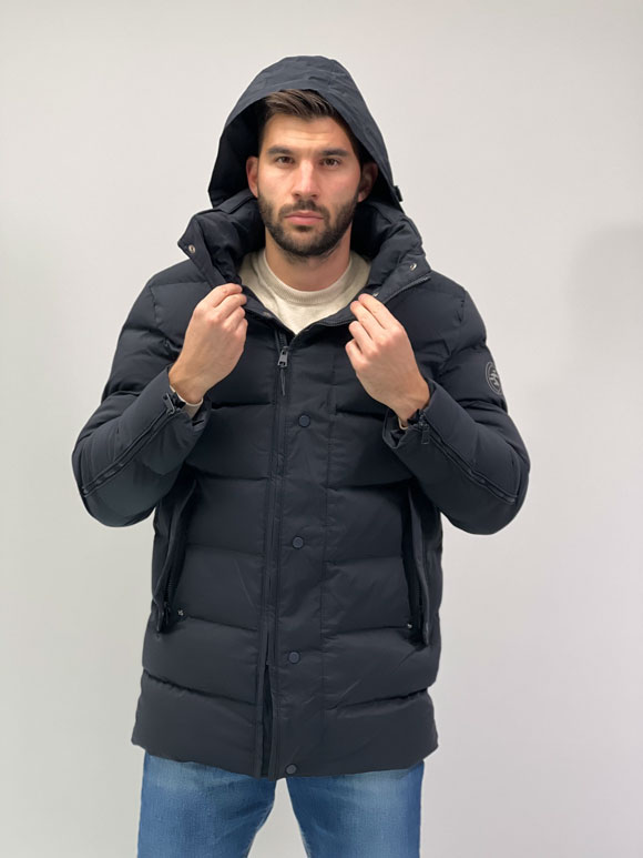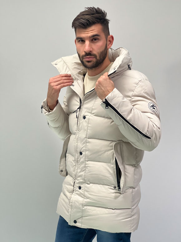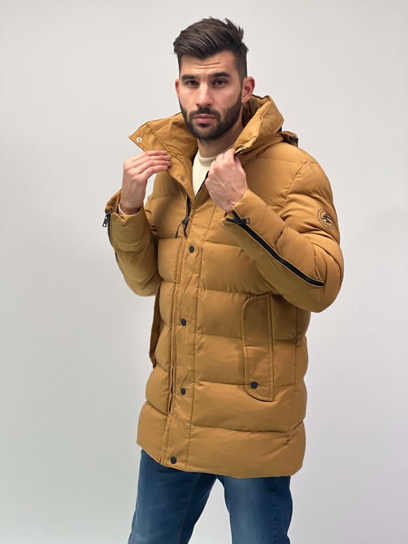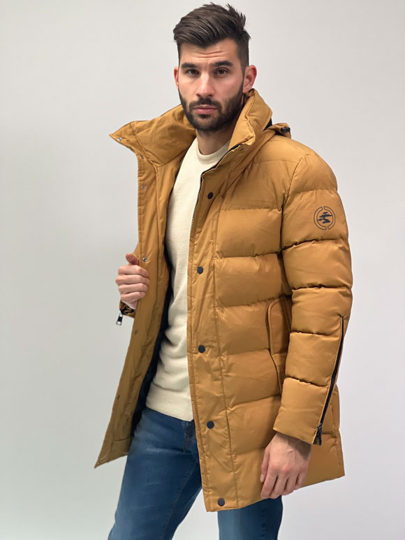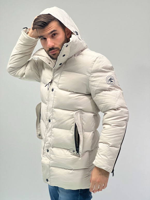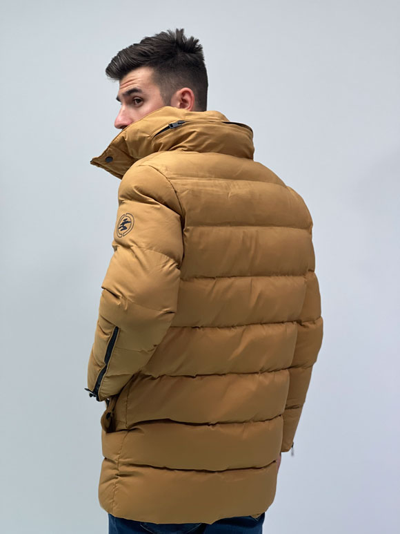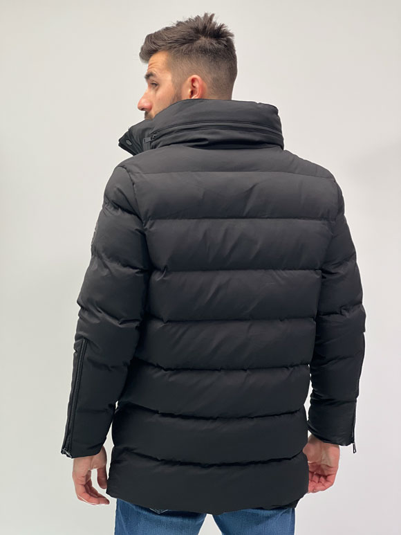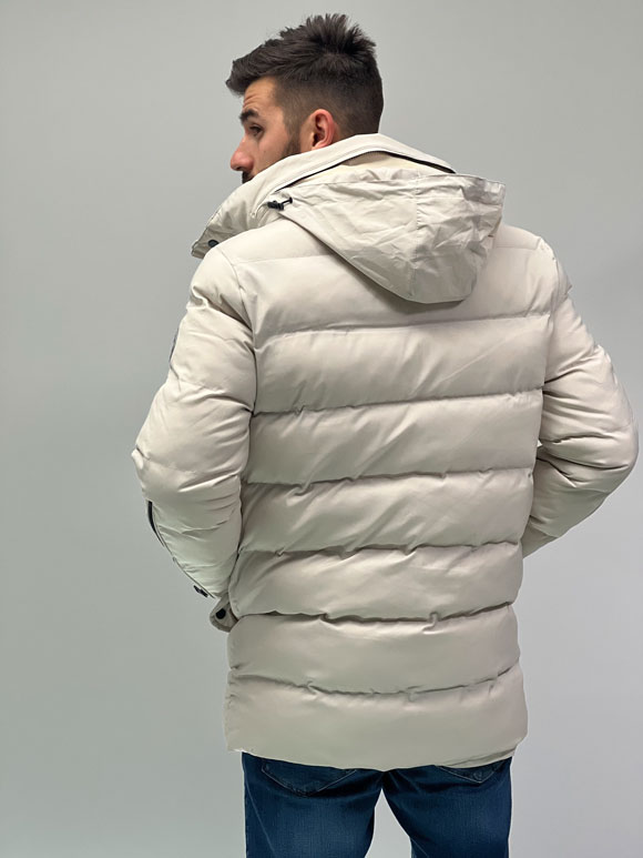 Muška duža zimska jakna pruža toplotu i stil. Džepovi sa cibzarom i preklopom na drikere kombinuju praktičnost i moderni izgled. Cipzari na rukavima omogućavaju prilagodbu stila. Kapuljača se može sakriti u kragnu za promenljive vremenske uslove. Materijal od poliestera s elastinom pruža toplotu i fleksibilnost. Ova zimska jakna spaja funkcionalnost i modu za udoban i moderan izgled tokom hladnih dana.