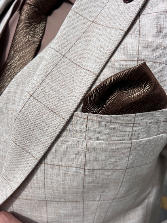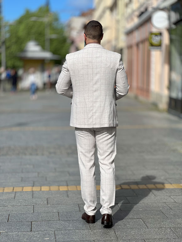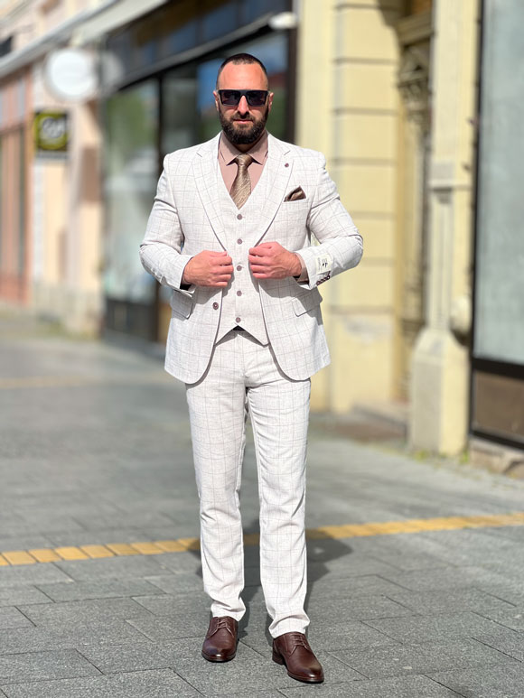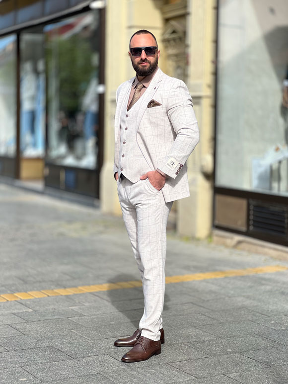 Ovo muško odelo predstavlja savršenu kombinaciju elegancije i modernog stila, izrađeno od visokokvalitetnog materijala koji uključuje poliester, viskozu i elastin. Ovi materijali pružaju udobnost, fleksibilnost i savršen pad tkanine, istovremeno održavajući izgled odelo čitavog dana. Boja bež dodaje sofisticiranost odelu, dok diskretne kockice tamnijih nijansi doprinose dinamičnosti i interesantnosti dizajna. Tamnije nijanse kockica diskretno ističu karakter odelu, dodajući mu dozu suptilnog šarma i elegancije. Odelo se sastoji od sakoa, prsluka i pantalona, što omogućava različite kombinacije i prilagođavanje različitim prilikama. Ovo odelo je idealan izbor za posebne prilike poput venčanja, poslovnih sastanaka ili formalnih događaja, ističući muškarčevu samouverenost i stil. Sa svojim sofisticiranim dizajnom i kvalitetnom izradom, ovo odelo će sigurno privući pažnju i ostaviti trajan utisak u svakoj prilici.