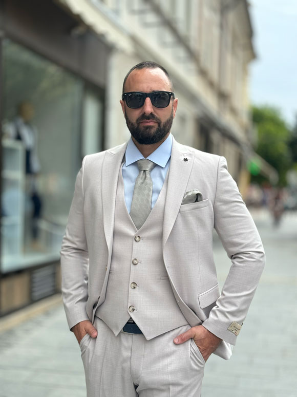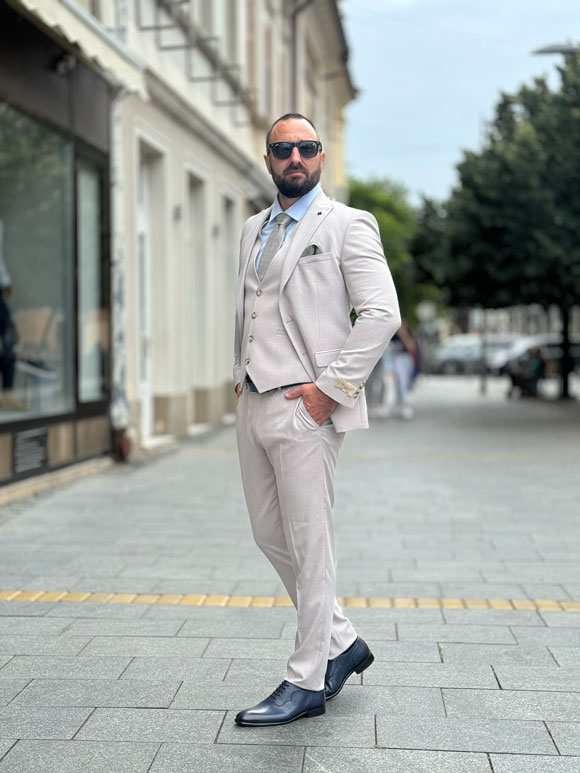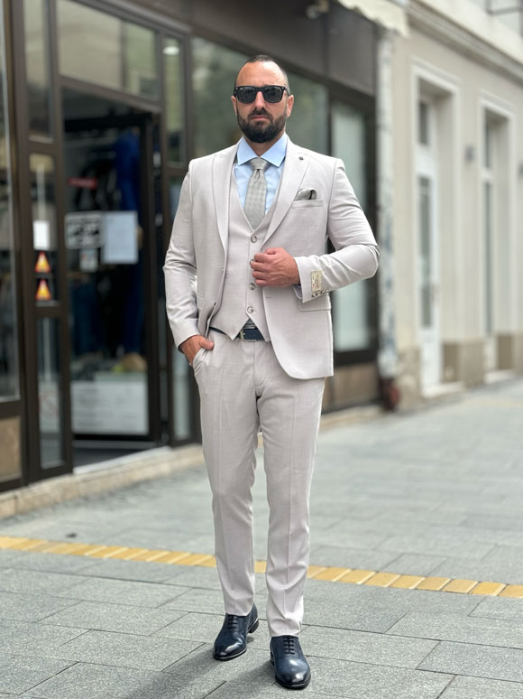 Ovo muško trodelno odelo je izrađeno od visokokvalitetnog materijala koji se sastoji od poliestera, viskoze i elastina. Ovaj spoj materijala pruža udobnost i fleksibilnost tokom nošenja, čineći ovo odelo idealnim za duže periode provedene u njemu.Ova elegantni idelo je pogodno za formalne događaje, kao što su venčanja ili poslovni sastanci.