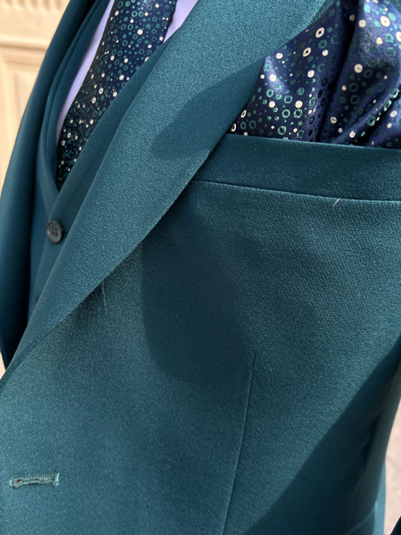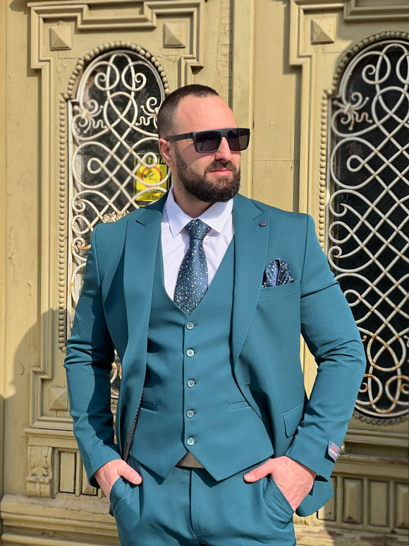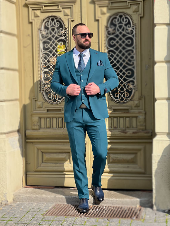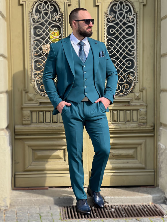 Ovo muško trodelno odelo u zelenoj boji predstavlja spoj sofisticiranog stila i udobnosti. Izrađeno je od visokokvalitetnih materijala poput vune, viskoze, poliestera i likre, obezbeđujući eleganciju i komfor u isto vreme. Zelena boja odelo čini vizuelno privlačnim i modernim. Kvalitetan vuneni materijal doprinosi toplini i luksuznom osećaju, dok viskoza dodaje mekoću i prozračnost. Dodatak likre pruža elastičnost i slobodu pokreta, čineći odelo udobnim tokom celog dana. Odelo se sastoji od sakoa, pantalona i prsluka. Ovo trodelno odelo je idealno za različite formalne ili poslovne prilike, pružajući muškarcu izuzetno stilizovan izgled.