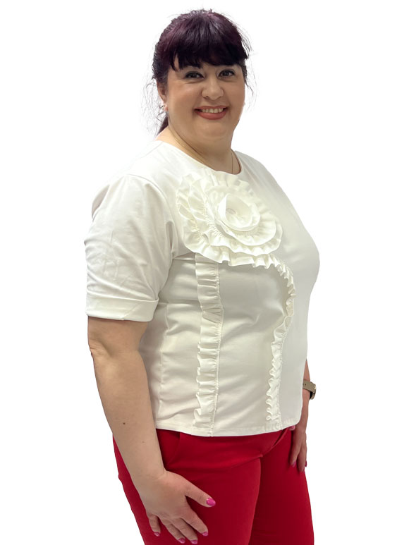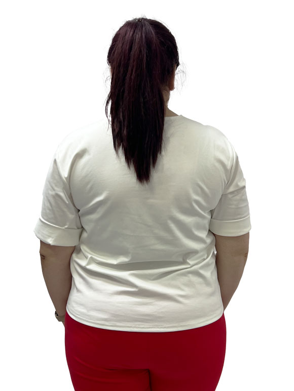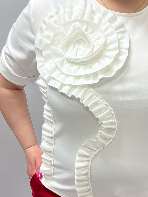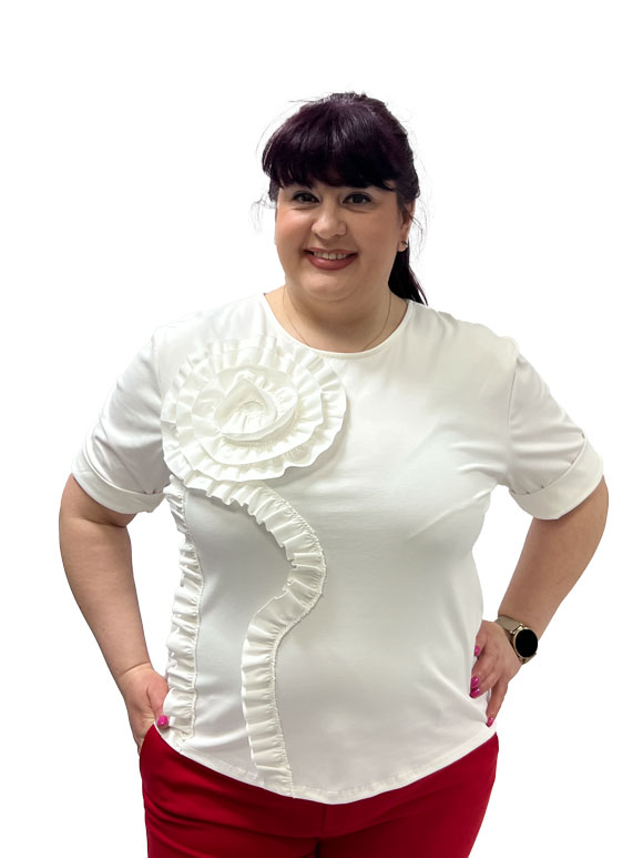 Ova predivna plus size bluza bele boje savršeno spaja udobnost i eleganciju. Izrađena je od mekanog pamuka pomešanog s poliamidom i elastinom, pružajući optimalnu udobnost i savršeno pristajanje. Njezina kratak rukav dodaje svježinu, idealan je izbor za tople dane ili slojevito oblačenje. Prednji deo krasi ruža, dodajući ženstveni dodir bluzi. Ova bluza je sjajan izbor za svaku priliku, od opuštenih šetnji do casual druženja s prijateljima, ističući vašu osobnost i stil s dozom udobnosti.