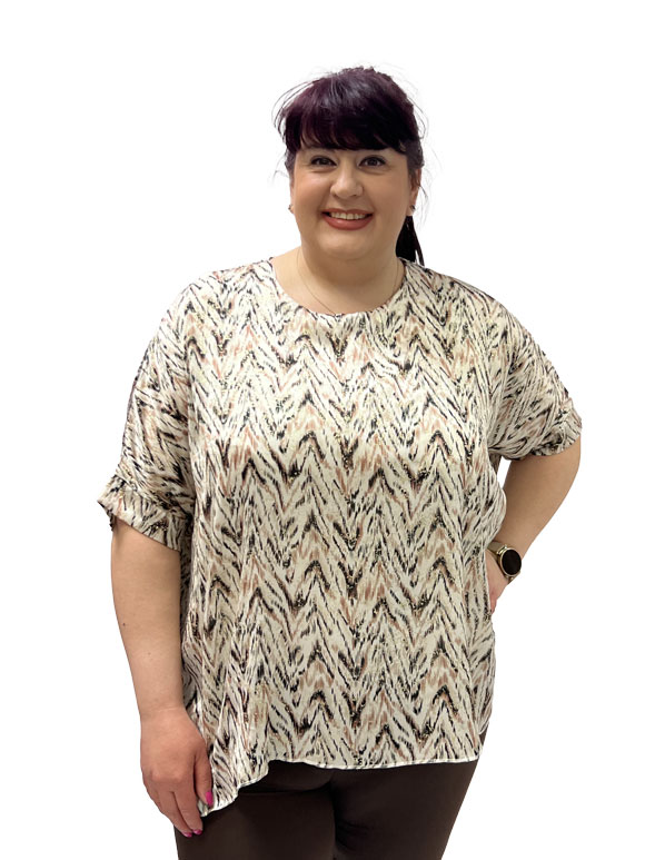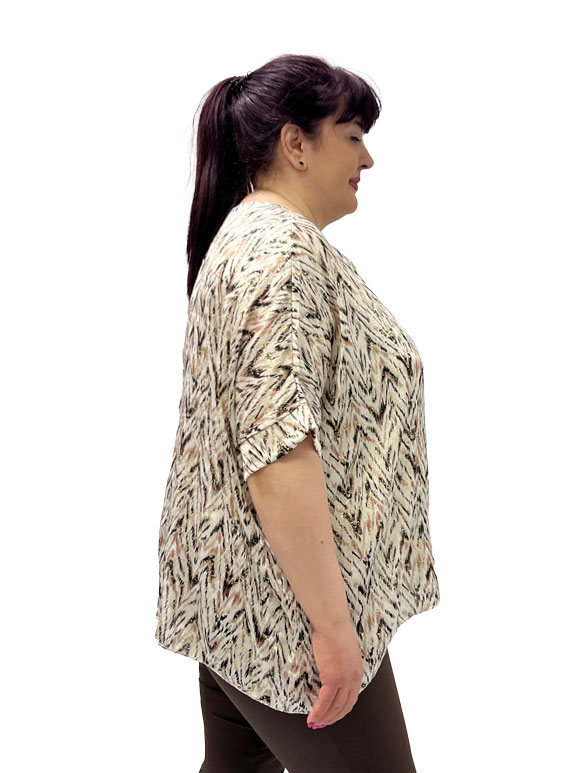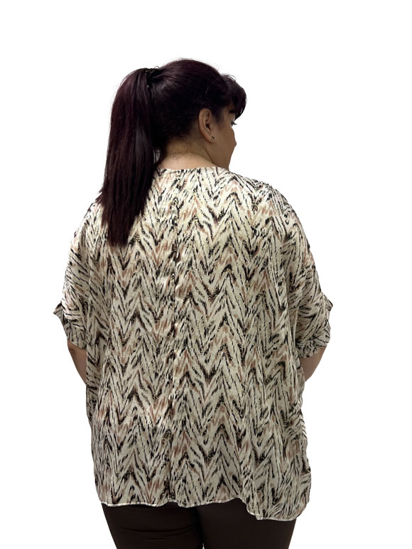 Ova plus size bluza kratkih rukava je savršena kombinacija udobnosti i stila! Izrađena od poliestera sa dodatkom elastina, pruža optimalnu udobnost i fleksibilnost. Bluza na krem osnovi je ukrašena prelepim detaljima u braon, crnoj, bež i zlatnoj boji, dodajući sofisticiranost i eleganciju. Bez obzira na priliku, ova bluza će vam pružiti samopouzdanje i udobnost dok ističe vaš jedinstveni stil.