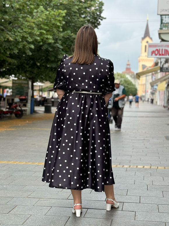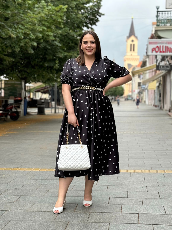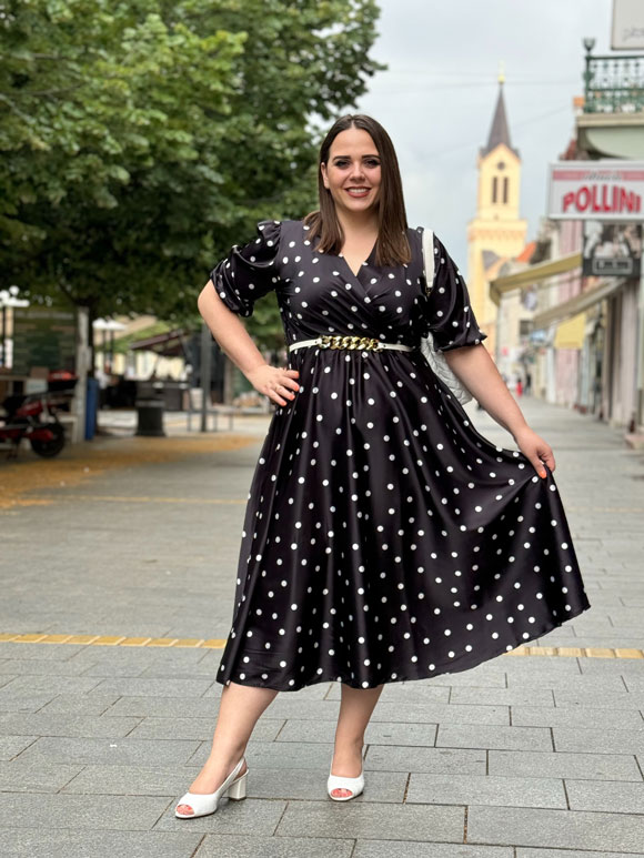 Ova ženska plus size haljina je savršen izbor za dame koje žele da se osećaju udobno, a istovremeno izgledaju elegantno i šik. Izrađena je od kvalitetnog materijala. Haljina je crne boje sa belim tufnama koje joj daju prefinjeni i šarmantni izgled. Ova kombinacija boja je klasična i veoma trendi, što čini ovu haljinu pogodnom za razne prilike. Haljina takođe dolazi sa pojasom. Ova plus size haljina ističe tvoju figuru na najlepši mogući način, naglašavajući obline bez da ih previše otkriva. Pruža ti samopouzdanje i udobnost tokom celog dana.
