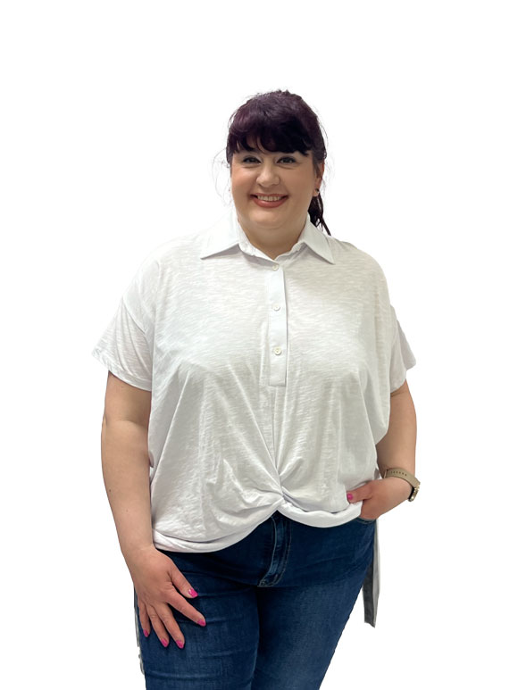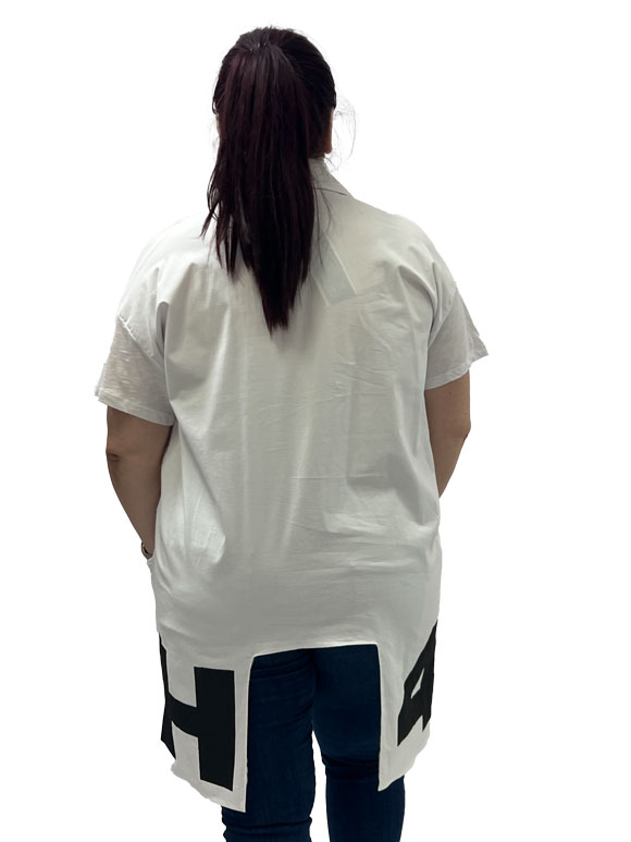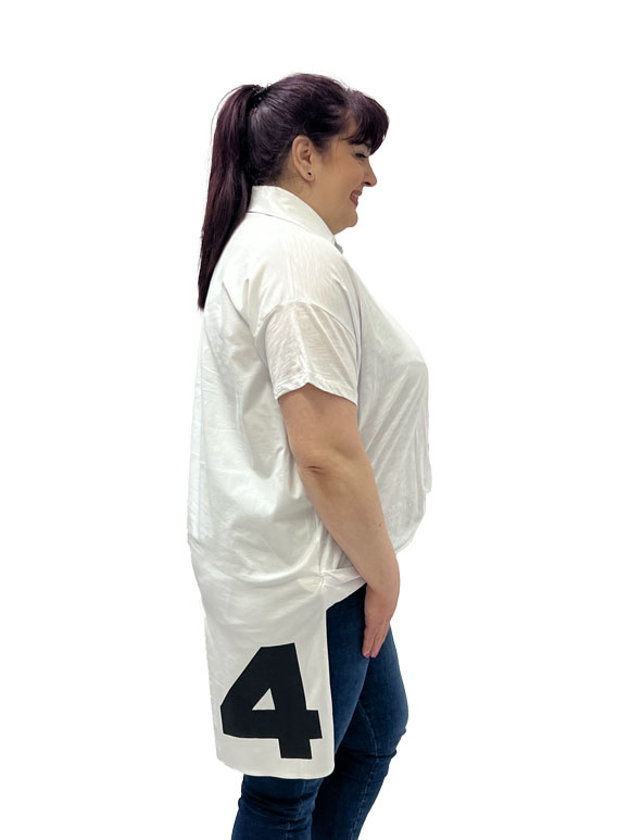 Ženska bela bluza plus size veličine je izrađena od pamuka sa dodatkom elastina, što pruža udobnost i fleksibilnost. Ova bluza ističe se svojim elegantnim dizajnom i posebnim detaljima. Ima klasičnu kragnu i dugmad napred, dodajući klasični šarm. Ono što čini ovu bluzu jedinstvenom su produžeci u obliku kocke na leđima, koji imaju aplikacije na sebi. Ovi detalji dodaju suptilnu dozu originalnosti i sofisticiranosti bluzi.