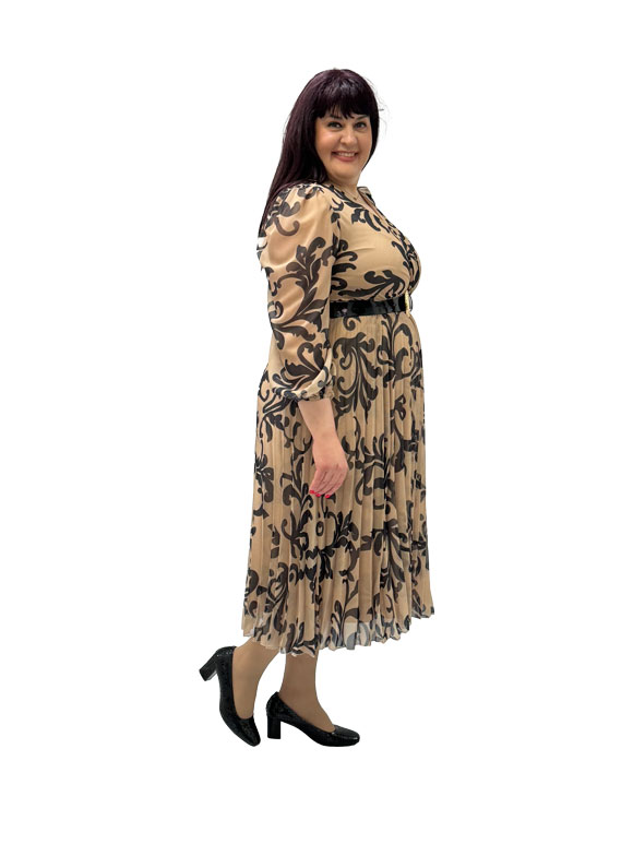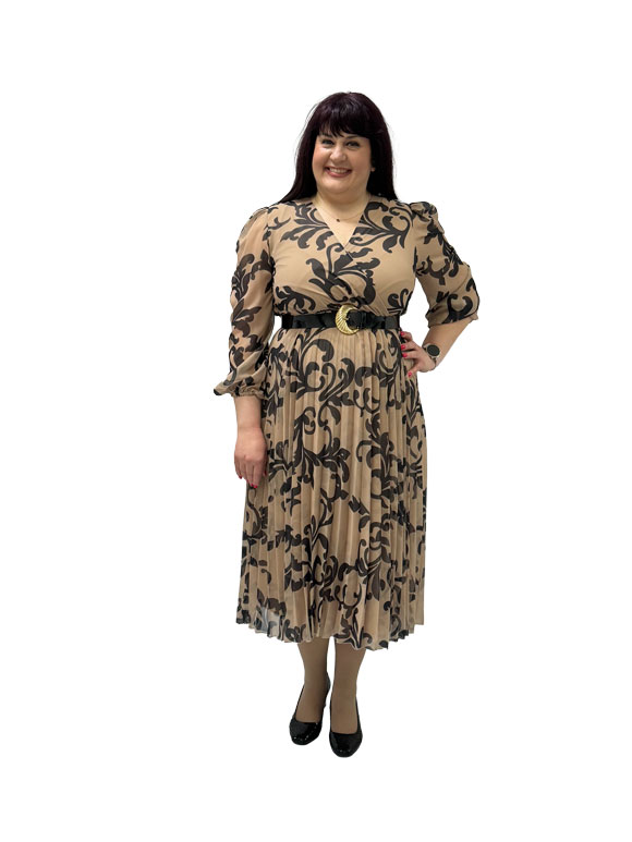 Ova ženska plus size haljina u bež boji sa braon detaljima je sofisticiran komad odeće koji istovremeno naglašava eleganciju i udobnost. Izrađena sa pažnjom prema oblinama ženskog tela, haljina je dizajnirana da istakne lepotu i pruži optimalnu udobnost. Bež osnova haljine pruža neutralnu paletu koja je lako kombinovana sa različitim stilovima. Braon detalji dodaju toplinu i dubinu, stvarajući elegantan kontrast. Haljina ima V izrez koji naglašava dekolte, pružajući ženstveni i privlačni izgled. Kaiš u struku dodaje oblik haljini, omogućavajući prilagođavanje i isticanje linije struka. Suknja u harmonika stilu je elegantna i pruža dodatni volumen i pokretljivost. Guma na rukavima dodaje suptilan detalj i pruža ležeran izgled, istovremeno održavajući sofisticiranost.