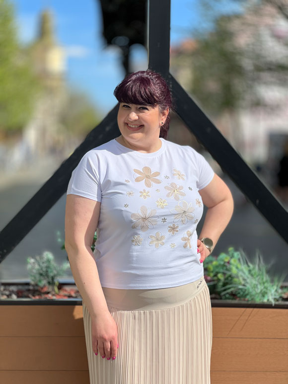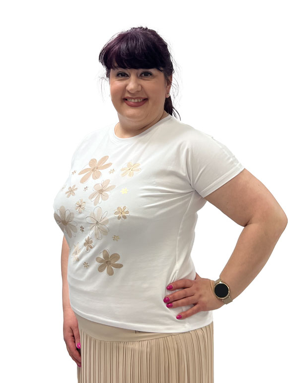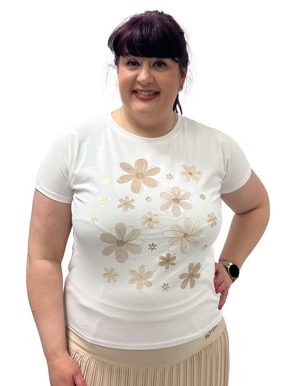 Ova ženska plus size bluza na kratke rukave kombinuje udobnost i stil na savršen način. Izrađena je od visokokvalitetnog pamuka sa dodatkom elastina, pružajući optimalnu udobnost i fleksibilnost tokom nošenja. Boja bele donosi osvežavajući izgled koji se lako uklapa u različite kombinacije i stilove. Aplikacija u obliku cvetova dodaje ženstveni i šarmantni dodir ovoj bluzi. Kratki rukavi čine ovu bluzu savršenom opcijom za toplije dane, pružajući udobnost i slobodu pokreta. Bez obzira da li je nosite sa farmerkama za opušteni izgled ili uz suknju za nešto formalniju priliku, ova bluza će vas učiniti elegantnom i sigurnom u svom izgledu.