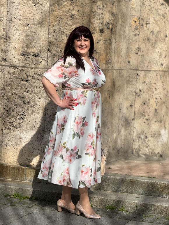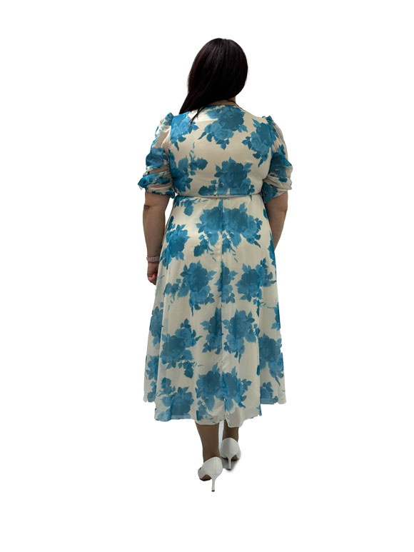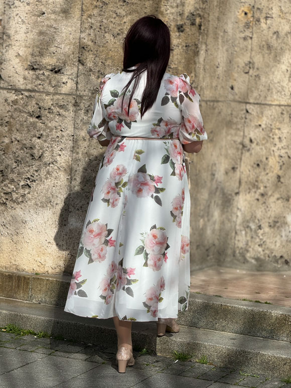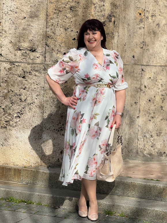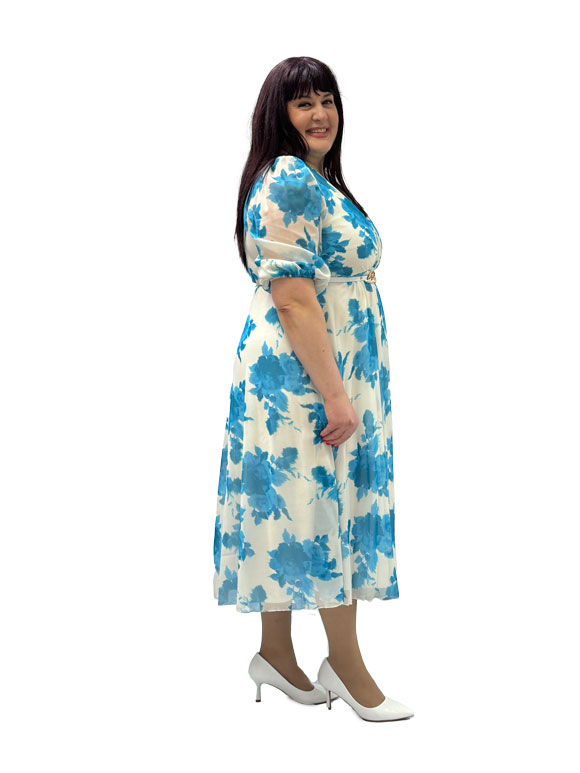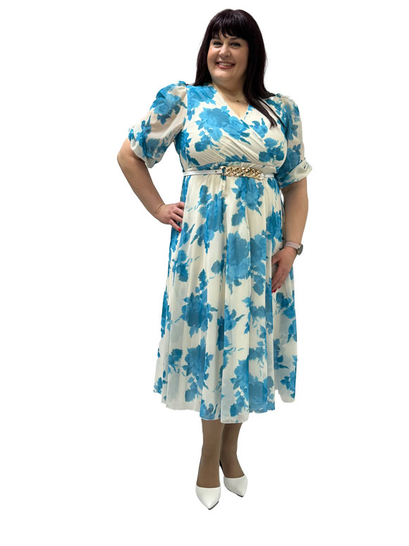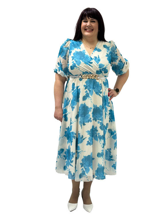 Ova plus size ženska haljina donosi osvežavajuću dozu stila i elegancije u svet mode. Sa svojim cvetnim dezenom, ova haljina odaje notu šarma i ženstvenosti. Izrađena od visokokvalitetnih materijala poput poliestera, viskoze i elastina, pruža ne samo elegantan izgled već i udobnost tokom nošenja. Poseban dodatak ove haljine je pojas sa lancem koji se nalazi ispod grudi. Ovaj detalj ne samo što ističe liniju struka, već i dodaje sofisticiranost i originalnost. Pojas sa lancem naglašava ženstvenu siluetu, pružajući dozu modernog šika. Cvetni dezen na haljini je veoma lep i elegantan, pružajući prijatan vizuelni dojam. Ova haljina je savršen izbor za razne prilike, od casual događaja do formalnijih okupljanja, jer kombinuje lepotu dezena sa udobnošću i prilagodljivosti materijala.