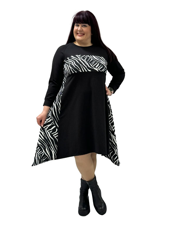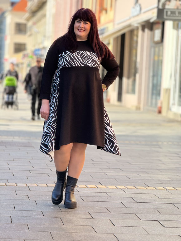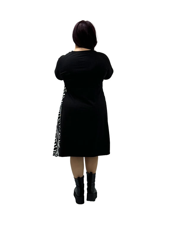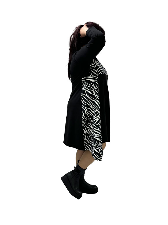 Ova plus size crna haljina predstavlja spoj elegancije, udobnosti i modernog stila, prilagođena za veličine od 46 do 50. Izrađena od visokokvalitetnog materijala koji uključuje pamuk, poliester i likru, haljina obezbeđuje udobnost, prozračnost i elastičnost za optimalno prilagođavanje vašem telu. Duži kroj rukava pružaja dodatnu pokrivenost, čineći ovu haljinu prikladnom za različite prilike tokom godine. Sveobuhvatna veličina čini je pristupačnom i prilagodljivom različitim figuarama, istovremeno ističući i naglašavajući vašu prirodnu lepotu. Šare zebra boje dodaju dozu zabave i dinamike haljini, čineći je vizualno atraktivnom. Ove šare unose moderni i trendi element u dizajn, čineći haljinu pogodnom za razne događaje – od formalnih do opuštenih.