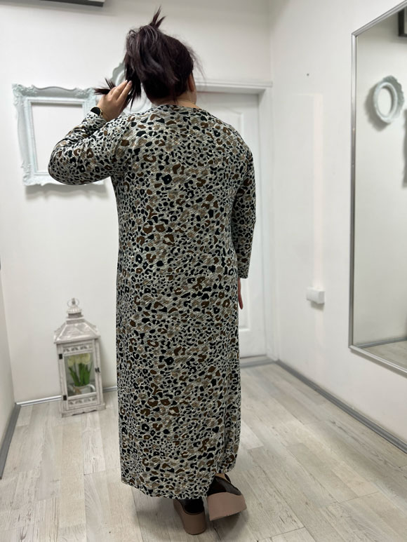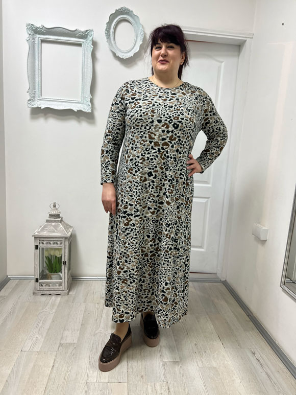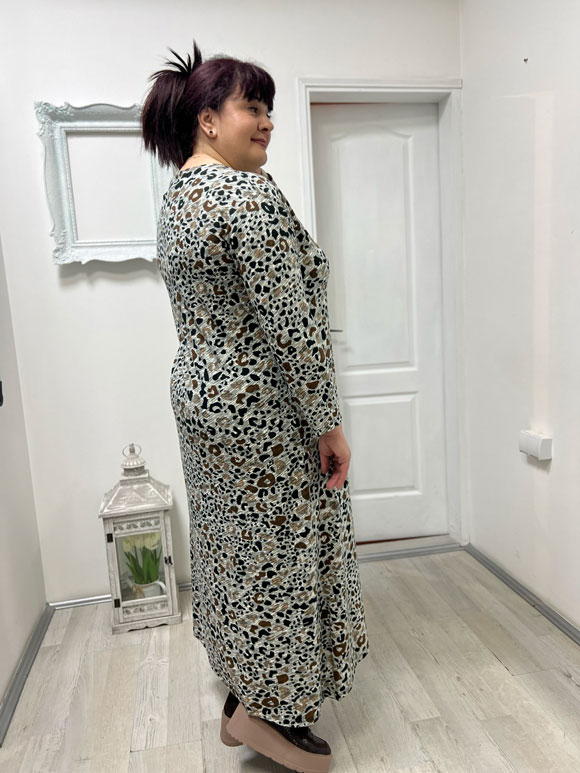 Ova plus size haljina je pravo remek-delo stila i udobnosti. Izrađena od viskoze i elastina, njen sastav obezbeđuje mekan dodir, savršeno prijanjanje uz telo i udobnost tokom celog dana. Haljina se ističe svojom dužinom i dugim rukavima, pružajući elegantan i sofisticiran izgled. Osim toga, bogatstvo boja na haljini – crna, bela i bez boja – stvara živopisan i moderni dizajn. Ova kombinacija boja dodaje dimenziju i dinamiku haljini, čineći je sjajnim izborom za različite prilike, od poslovnih sastanaka do večernjih izlazaka. Suptilan spoj crne, bele i bez boja čini haljinu svestranom i lako kombinovljivom sa različitim modnim dodacima i obućom. Bez obzira na to da li je nosite uz elegantne čizme ili udobne baletanke, ova haljina će vam omogućiti da se osećate samouvereno i privlačno.