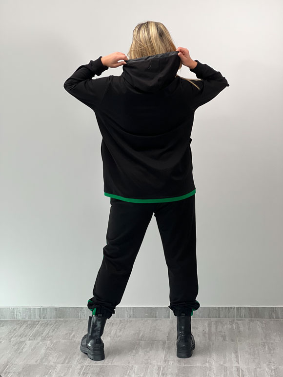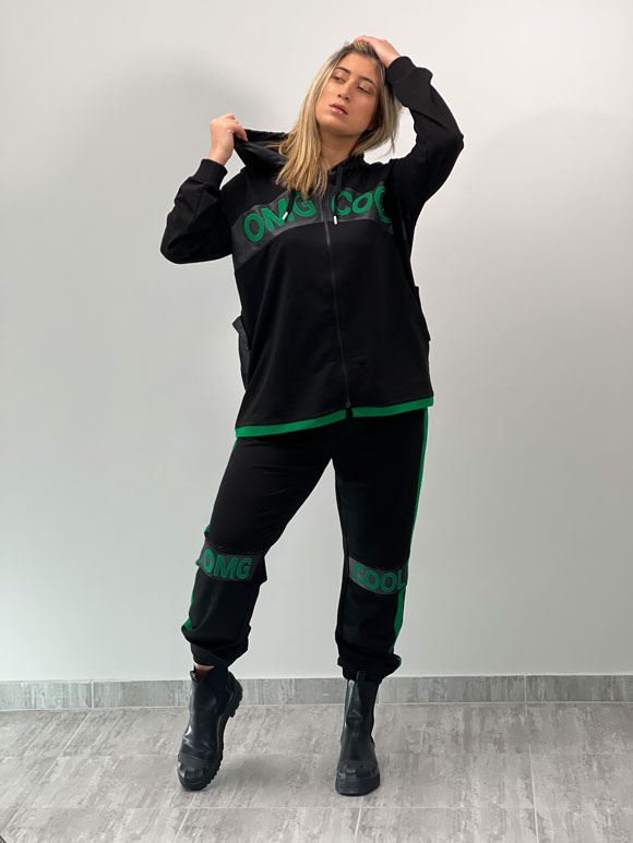 Ovaa plus size ženska komplet trenerka savršeno kombinuje stil, udobnost i trendi detalje. Donji deo i gornji duks s kapuljačom izrađeni su od poliestera, pamuka i likre, pružajući mekan dodir i prozračnost. Crna boja s zelenim detaljima stvara moderan izgled, dok natpisi „cool“ i „omg“ dodaju urban šarm. Pogodan za različite aktivnosti, ovaj komplet je idealan za opuštene trenutke ili sportske aktivnosti.
