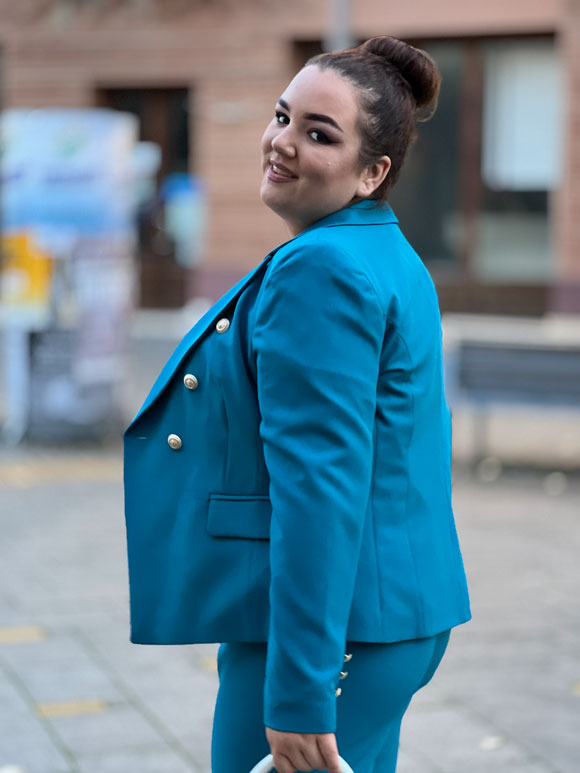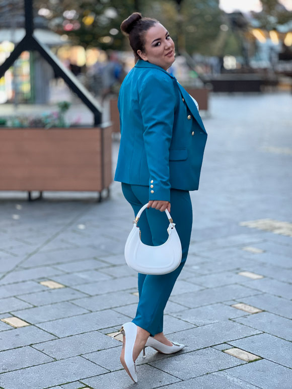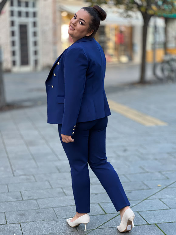 Ovaj elegantni plus size ženski komplet, sa pantalonama i sako-m, pruža sofisticiran izgled i udobnost. Materijal od poliestera i viskoze kombinuje luksuz i prozračnost. Sa bezbroj mogućnosti kombinacija, od poslovnih sastanaka do casual prilika, ovaj komplet je prilagodljiv i elegantan. Dizajniran za plus size figuru, pantalone i sako ističu obline, a prisutni dzepovi dodaju funkcionalnost. Zlatna dugmad na sako-u i rukavima pružaju dodatnu eleganciju.