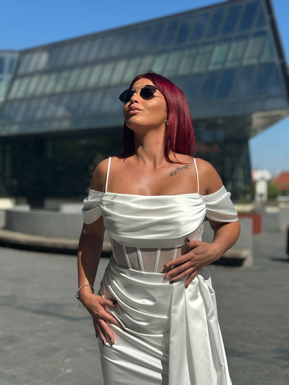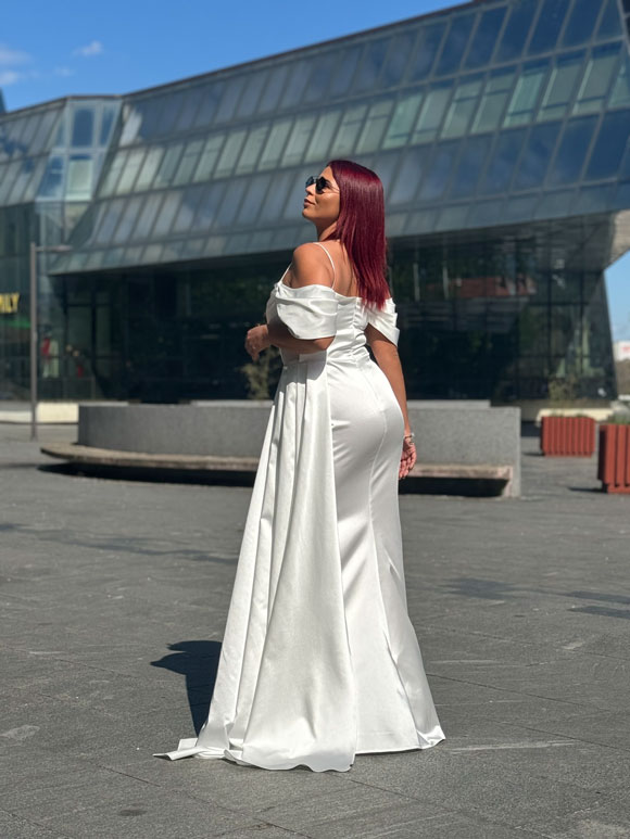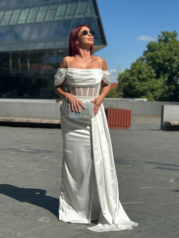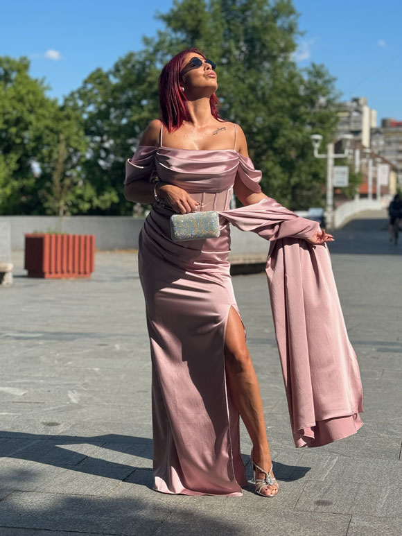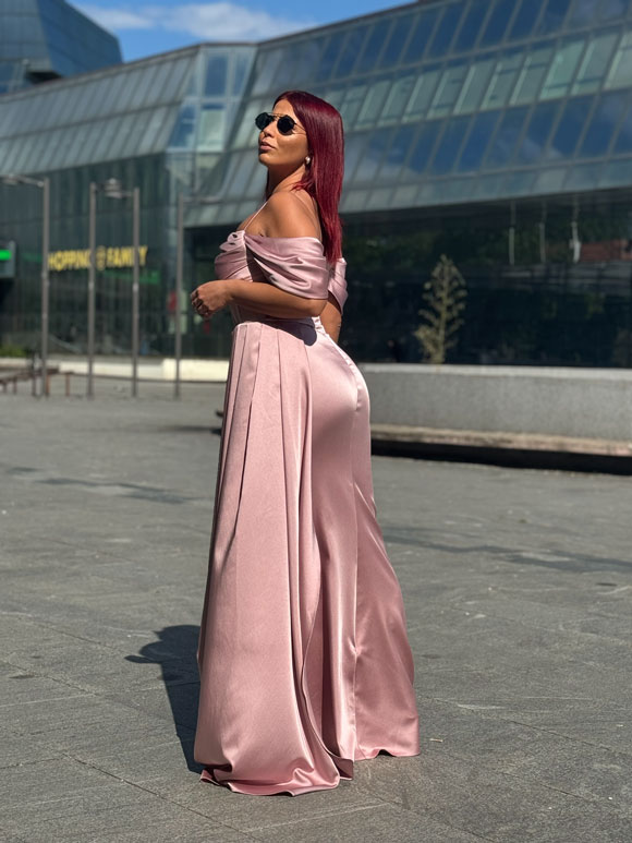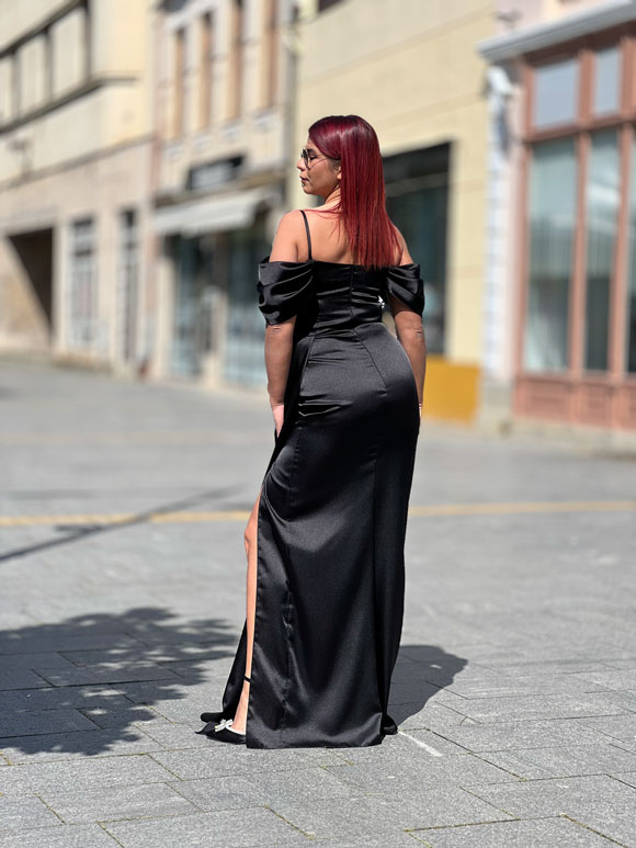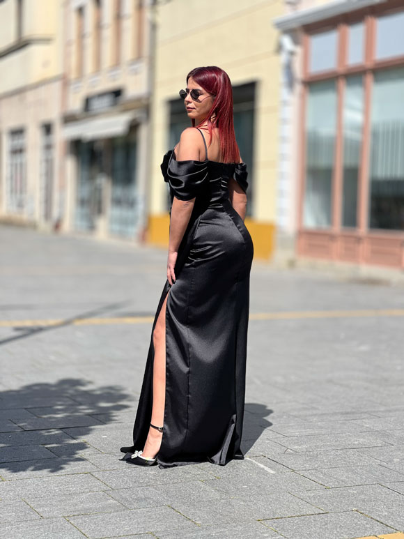 Ova zavodljiva ženska duga  haljina odiše sofisticiranošću i elegancijom. Napravljena je od satena, pružajući bogat sjaj i luksuzan izgled, dok kombinacija poliestera i likre osigurava udobnost i savršeno prianjanje uz telo. Haljina ima dubok dekolte koji privlači pažnju i dodaje dozu senzualnosti. Tanke bretele dodaju ženstvenost, dok spušteni rukavi pružaju suptilan i elegantan izgled. Ova haljina je savršen izbor za posebne prilike, poput večernjih događaja ili svečanih proslava. Njena  boja donosi dozu glamura i klasične elegancije, dok materijal satena pruža nevjerojatan osjećaj luksuza. Noseći ovu haljinu, istaknućete svoju sofisticiranost i samopouzdanje s besprekornim stilom.