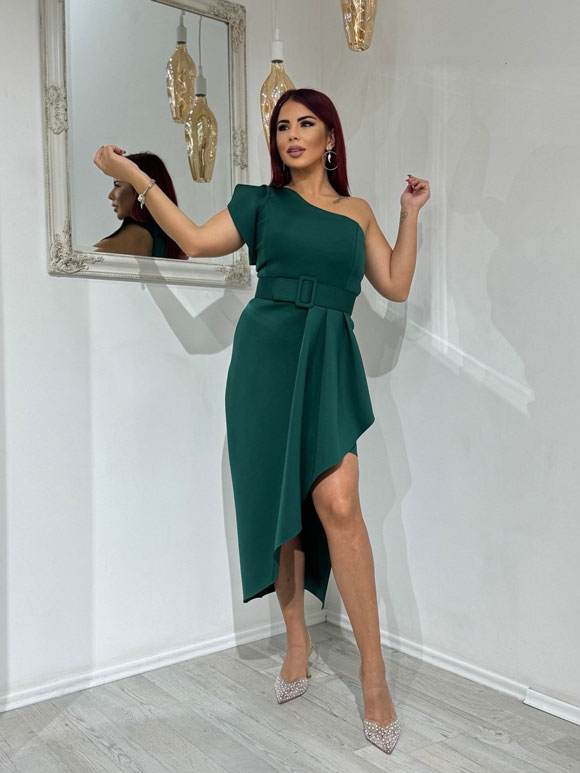 Ova ženska haljina je moderna i trendi, savršena za posebne prilike ili večernje izlaske. Njena asimetrična silueta daje joj jedinstven izgled koji će sigurno privući pažnju. Haljina je dizajnirana sa samo jednim rukavom, stvarajući senzualan i atraktivan izgled. Kratki bomber rukav dodaje dozu moderne elegancije, ističući ramena na vrlo privlačan način. Dodatni detalj ove haljine je pojas koji se vezuje oko struka. Pojas ima funkciju naglašavanja tvoje figure i prilagođava se tvojoj veličini kako bi ti pružio udobnost tokom nošenja. Materijal ove haljine je visokokvalitetan i prijanja uz tvoje telo na veoma laskav način. Asimetrični kroj dodaje dinamiku ovom komadu, dok istovremeno omogućava slobodu pokreta. Ova haljina može biti sjajan izbor za sve vrste događaja – od koktela do gala večera. Može se kombinovati sa elegantnim cipelama visokih potpetica za sofisticiraniji izgled ili sa sandalama za ležerniju varijantu. Ukratko, ova moderna asimetrična haljina sa jednim rukavom, kratkim bomber rukavom i pojasom oko struka donosi kombinaciju elegancije i trendi stila koja će te učiniti zapaženom gde god da se pojaviš.