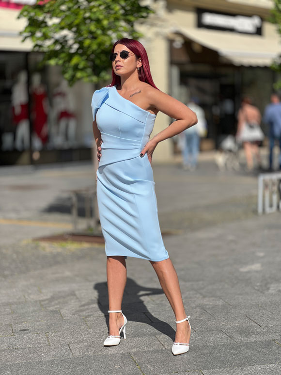 Ova ženska haljina odiše elegancijom i sofisticiranošću. Dizajnirana je s jednim ramenom, dodajući suptilan, ali efektan dodir elegancije. Na ramenu ističe se prekrasna mašna, koja dodaje notu ženstvenosti i šarma. Izrađena je od visokokvalitetnog poliestera s dodatkom elastina, što osigurava udobnost i fleksibilnost tokom nošenja, istovremeno zadržavajući besprekoran izgled. Ova haljina dolazi u raznolikom spektru boja, pružajući mogućnost odabira prema individualnom stilu i preferencijama.