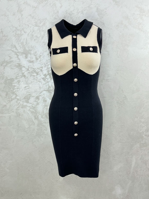 Ova ženska haljina predstavlja spoj elegancije i modernog dizajna. Bez rukava i s klasičnom kragnom, haljina naglašava ženstvenost i sofisticiranost. Boja crne osnove s krem detaljima stvara kontrast koji ističe eleganciju, pružajući haljini sofisticiran izgled. Prednji deo haljine ukrašen je dugmadima, dodajući element klasičnog stila i istovremeno omogućavajući praktično oblačenje. Materijal koji je korišćen, viskoza i najlon, doprinosi mekoći i fluidnosti haljine, čineći je udobnom za nošenje i prilagodljivom različitim prilikama. Ova haljina je idealan izbor za posebne događaje, večernje izlaske ili druge formalne prigode. Njezin sofisticirani dizajn i pažljivo birani materijali čine je izuzetnim komadom garderobe koji istovremeno odražava suptilnu eleganciju i modernu ženstvenost.