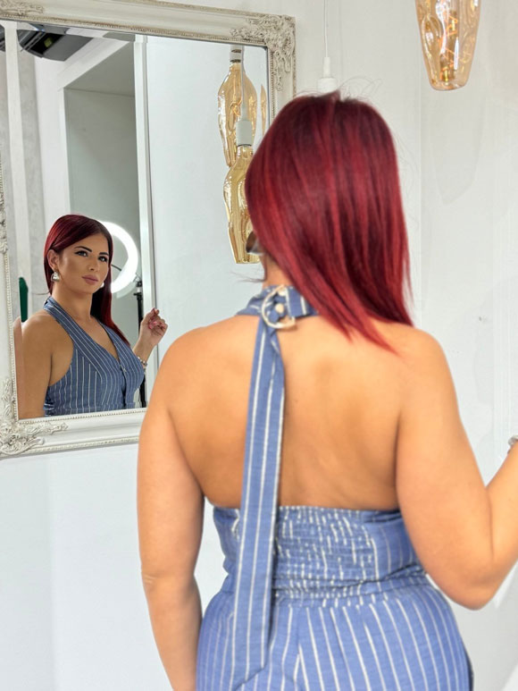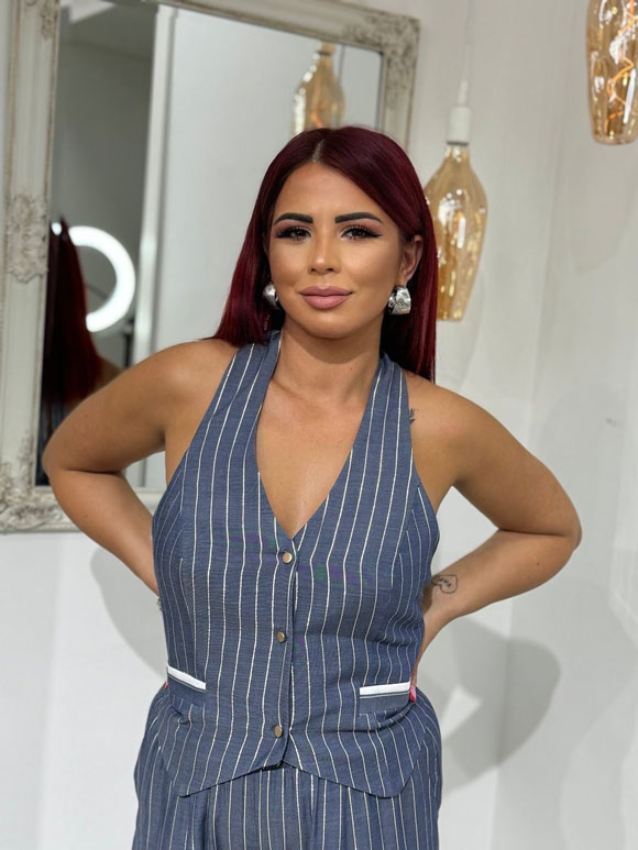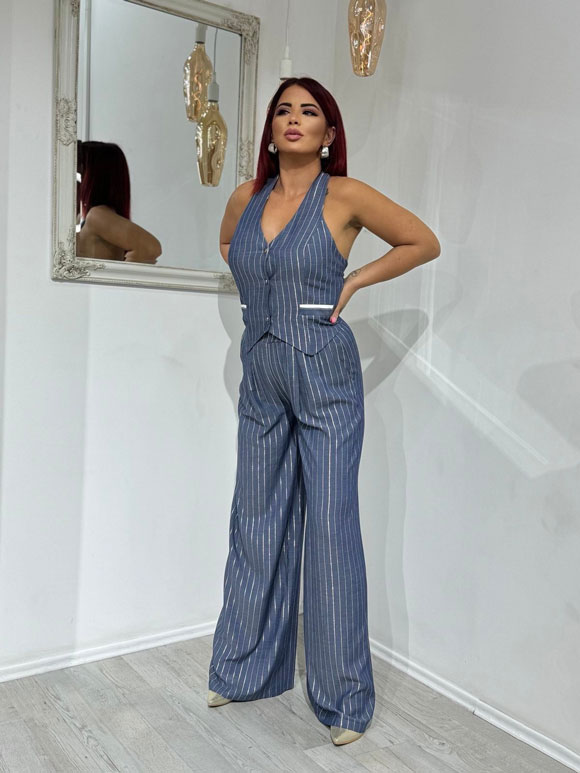 Ovaj ženski komplet je savršen izbor za moderne i trendi kombinacije. Sastoji se od pantalona i gornjeg dela prsluka koji je dizajniran da ide preko vrata. Pantalone su izrađene od visokokvalitetnog materijala koji prijanja uz telo, pružajući udobnost tokom celodnevnog nošenja. Imaju uski kroj koji naglašava liniju tela na elegantan način. Gornji deo kompletak je prsluk koji se lako kopča dugmadima na prednjoj strani. Ovaj detalj čini komplet višedimenzionalnim, omogućavajući vam da eksperimentišete sa stilovima i kreirate različite izglede. Možete ga nositi kao otvoreni prsluk sa košuljom ispod ili zatvoreni za sofisticiraniji izgled. Ovaj ženski komplet može se kombinovati kako sa patikama za sportski-casual stil, tako i sa stiklama za elegantniju varijantu. Bez obzira na to kako ga nosite, sigurno ćete privući pažnju svojim stilom. Komforan materijal, praktično zakopčavanje i mogućnost kombinovanja sa različitom obućom čine ovaj ženski komplet idealnim izborom za moderne žene koje cene modnu fleksibilnost bez gubitka udobnosti i stila.